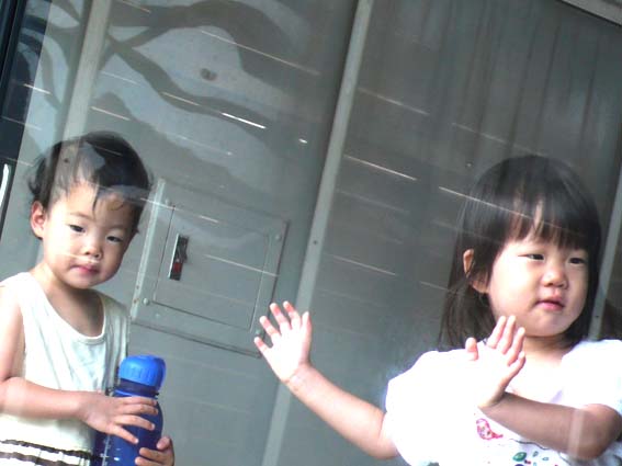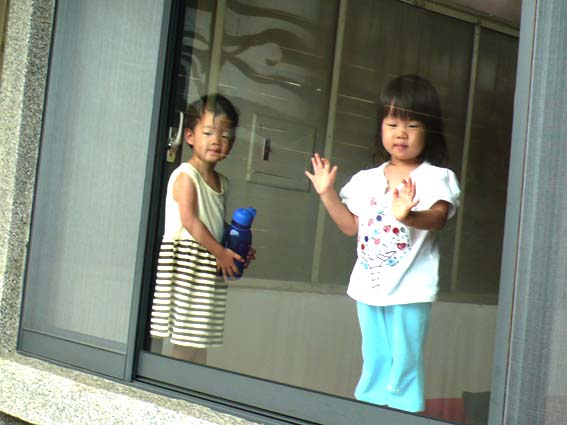 ▲姊妹兩站在客廳窗台目送瓶子阿姨-2(左邊是妹妹像把拔,右邊是姊姊像馬麻,不太像的雙胞胎)