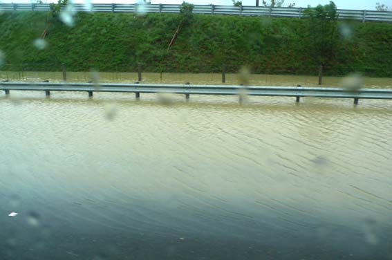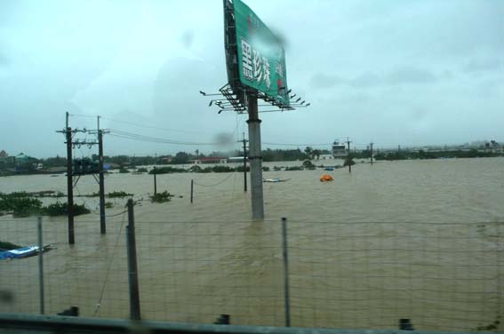 隔天(8/9),早上,阿母用哥哥的手機打給我,告訴我家裡淹水了先別回台南,我沒跟家裡說要回去,所以他們並不知道我已經在台南了,在朋友熱情的招待的午餐後,我就馬上搭著客運要回台中了,沿路上有些路段依舊積水,高速公路旁的t霸甚至倒在水裡,沿途一群群小鴨小鵝全都躲到屋頂上,當車子經過西螺大橋時,看著滾滾黃水,彷彿橋將被沖斷,我一刻也不敢閉上眼睛休息,只希望趕快經過這個路段,偏偏這時候有點小塞車,車子有點緩慢,嚇得自己都快哭了直到過了那個路段。