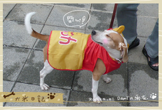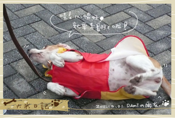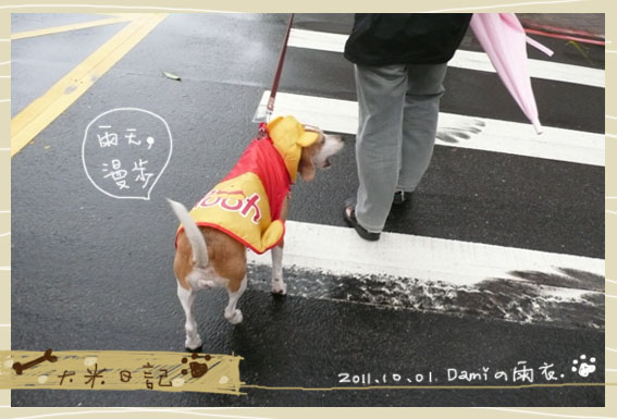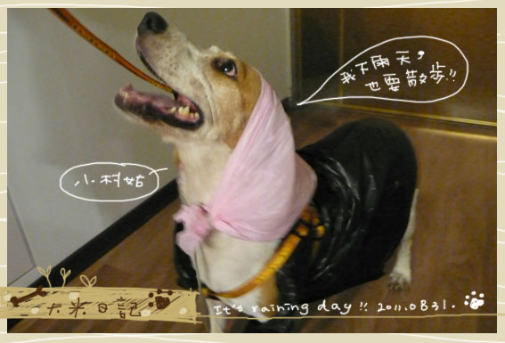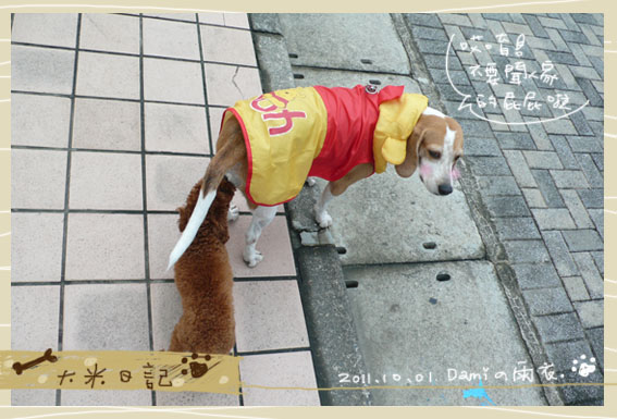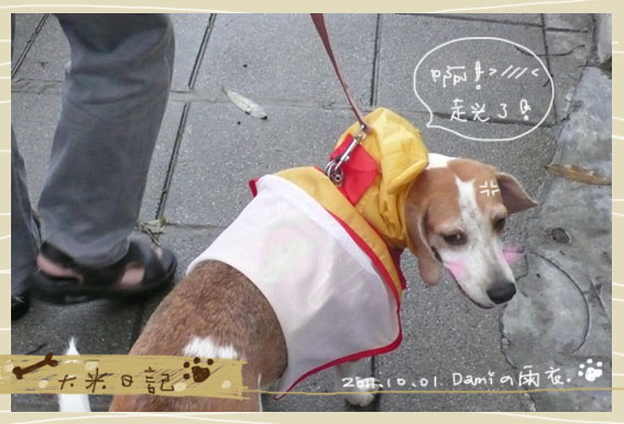 又下雨了,大米還是想出去散步,所以幫她穿上新買的雨衣,